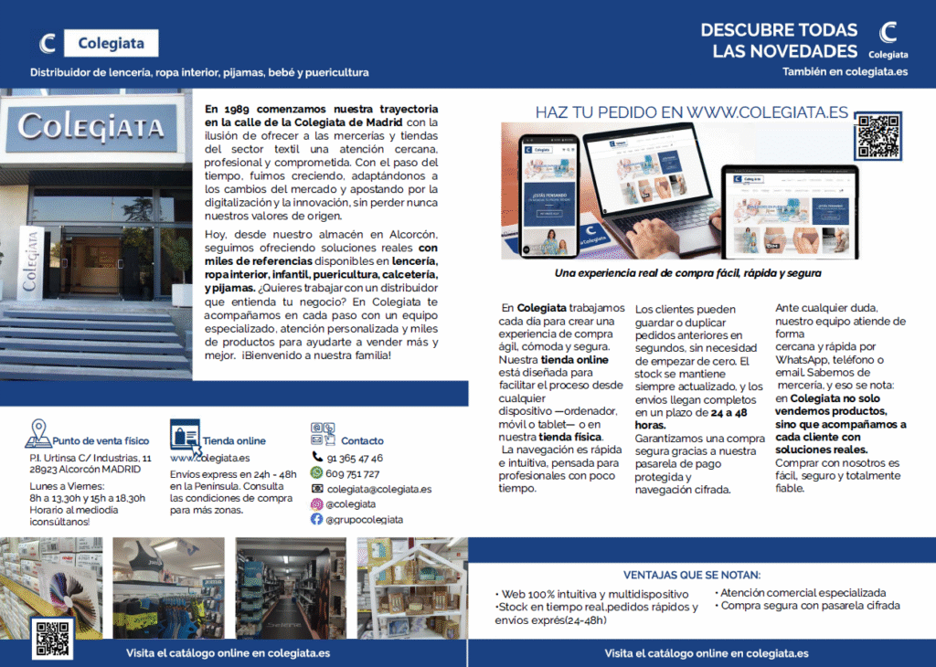 Hoy, desde nuestro almacén en Alcorcón, seguimos ofreciendo soluciones reales con miles de referencias disponibles en lencería, ropa interior, infantil, puericultura, calcetería, pijamas. ¿Quieres trabajar con un distribuidor que entienda tu negocio? En Colegiata te acompañamos en cada paso con un equipo especializado, atención personalizada y miles de productos para ayudarte a vender más y mejor. ¡Bienvenido a nuestra familia!
